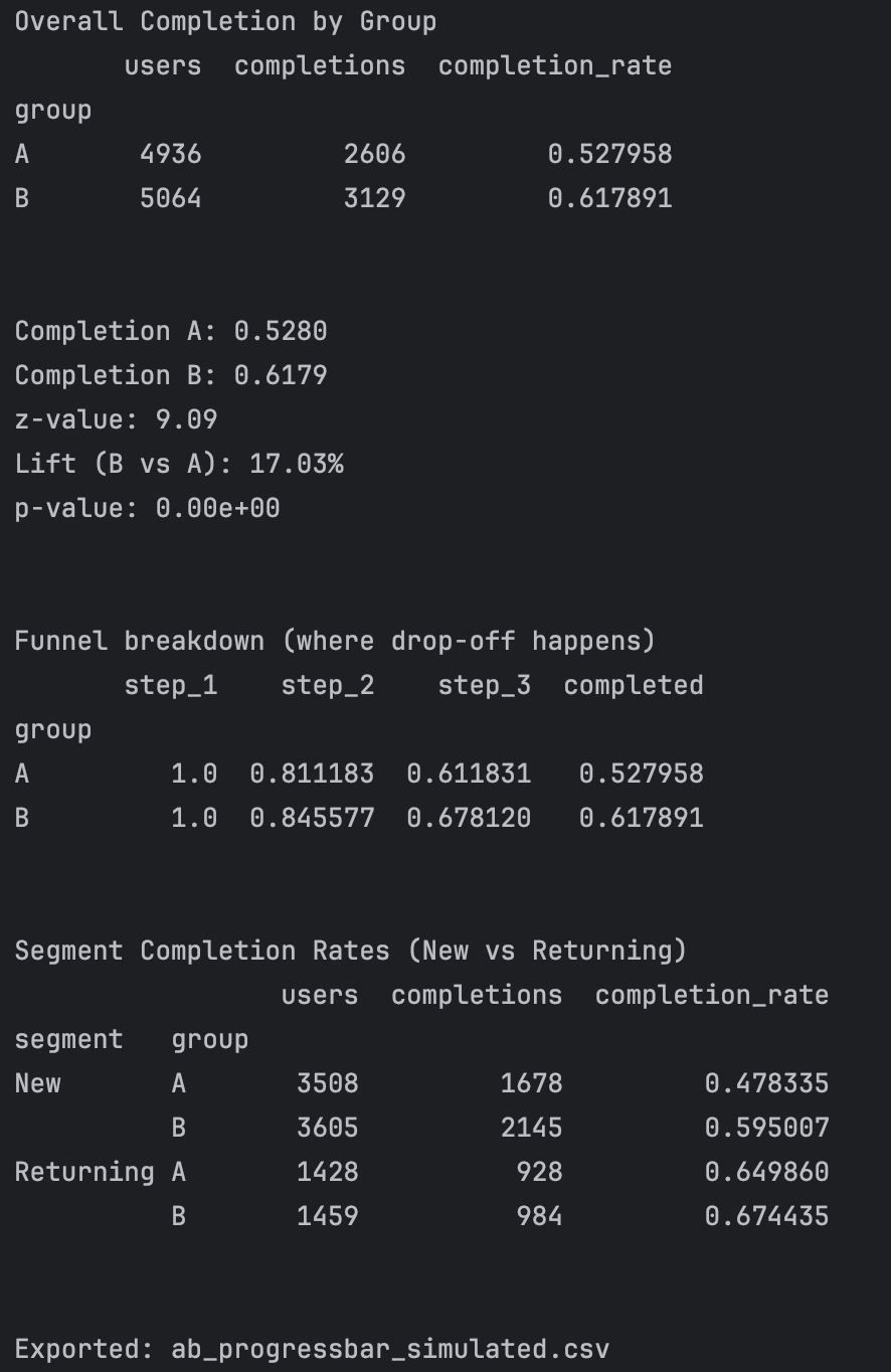 A two-proportion z-test was used to quantify whether differences in completion rates between the two variants were statistically significant. Results showed a meaningful lift in completion for the treatment group, with the strongest impact observed among new users.